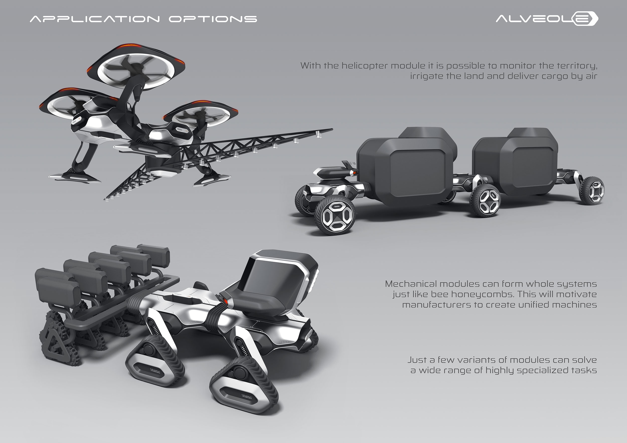 简介:VALTA单元是未来农业的哲学。它侧重于一种特殊的农业生产。它受到大自然的启发,是一种高效、简单的系统,它像活的生物体一样工作。基本模型是一套四个多用途车辆和一个主要任务中央单元,可以通过搭接不同的作业设备完成不同的农场作业(以谷物提高机为例)。这些多功能拖拉机在田间工作,而独立的中央单元可以实现主要操作。